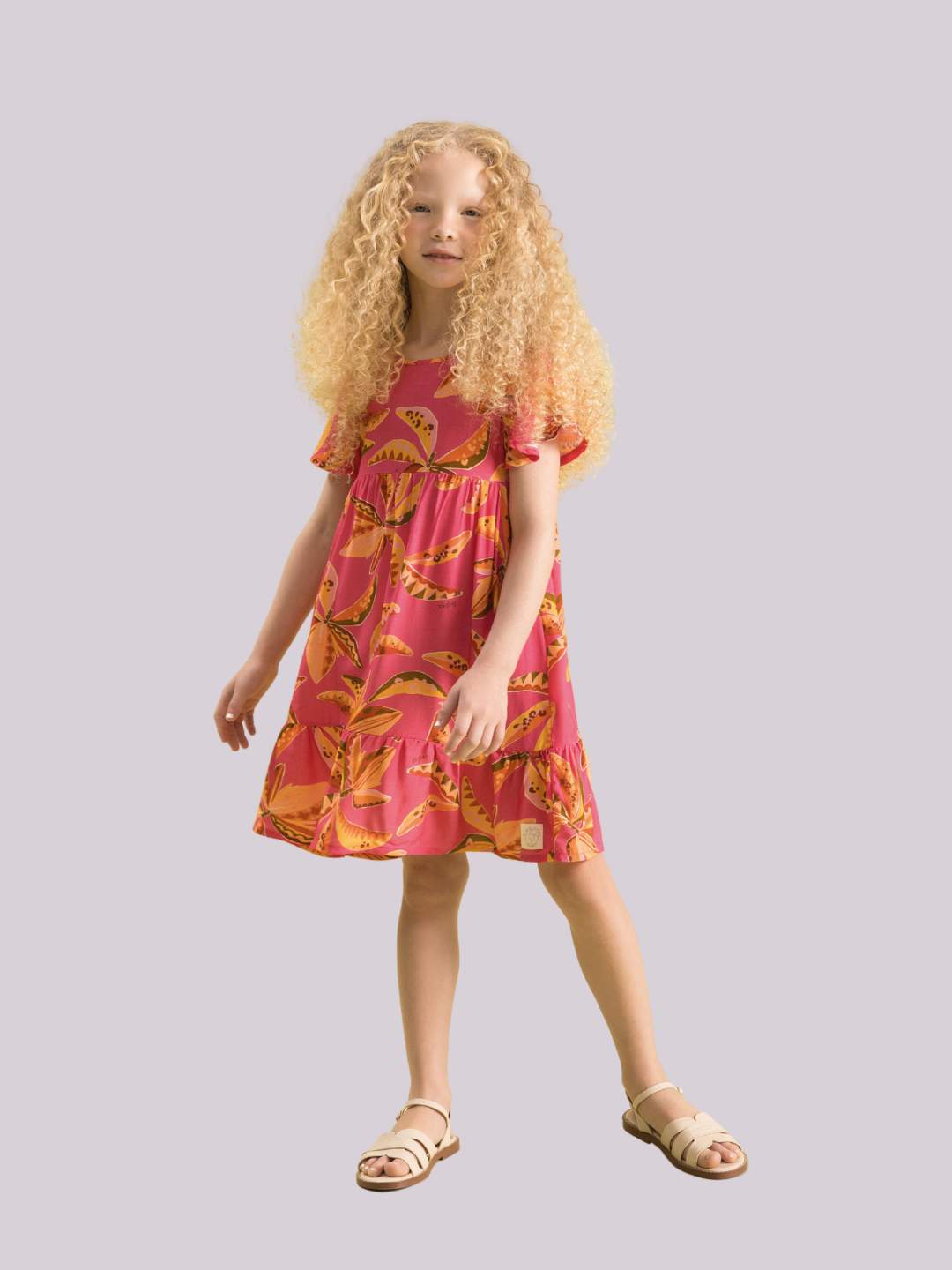 Vestido infantil estampado tropical, leve, confortável e cheio de cor, ideal para looks frescos e encantadores.